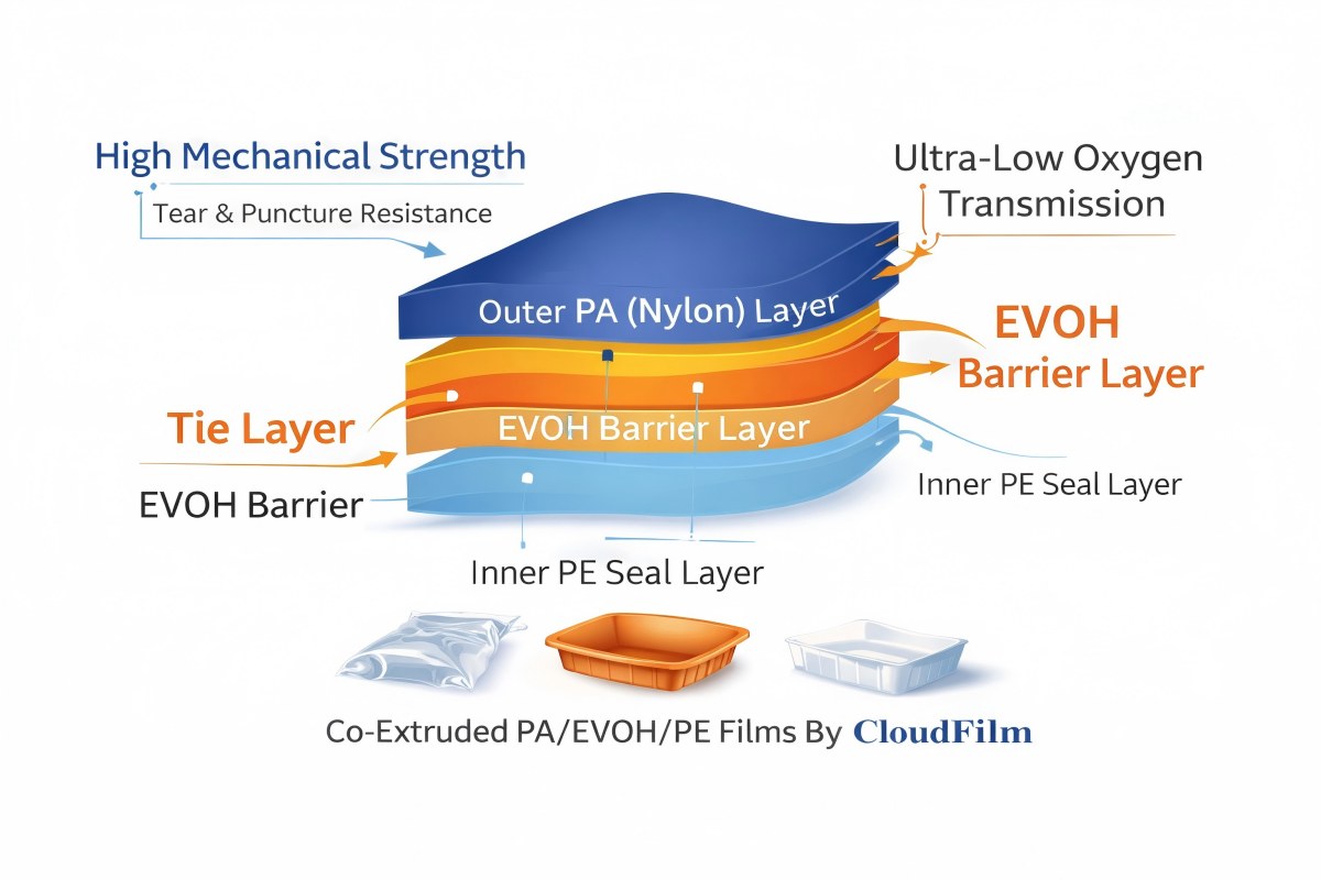 In CloudFilm’s high-barrier product range, EVOH is typically used as a 3–15 μm core layer inside PA/EVOH/PE, PE/EVOH/PE or PP/EVOH/PP co-extruded films to achieve very low OTR while keeping the structure thin and cost-effective.