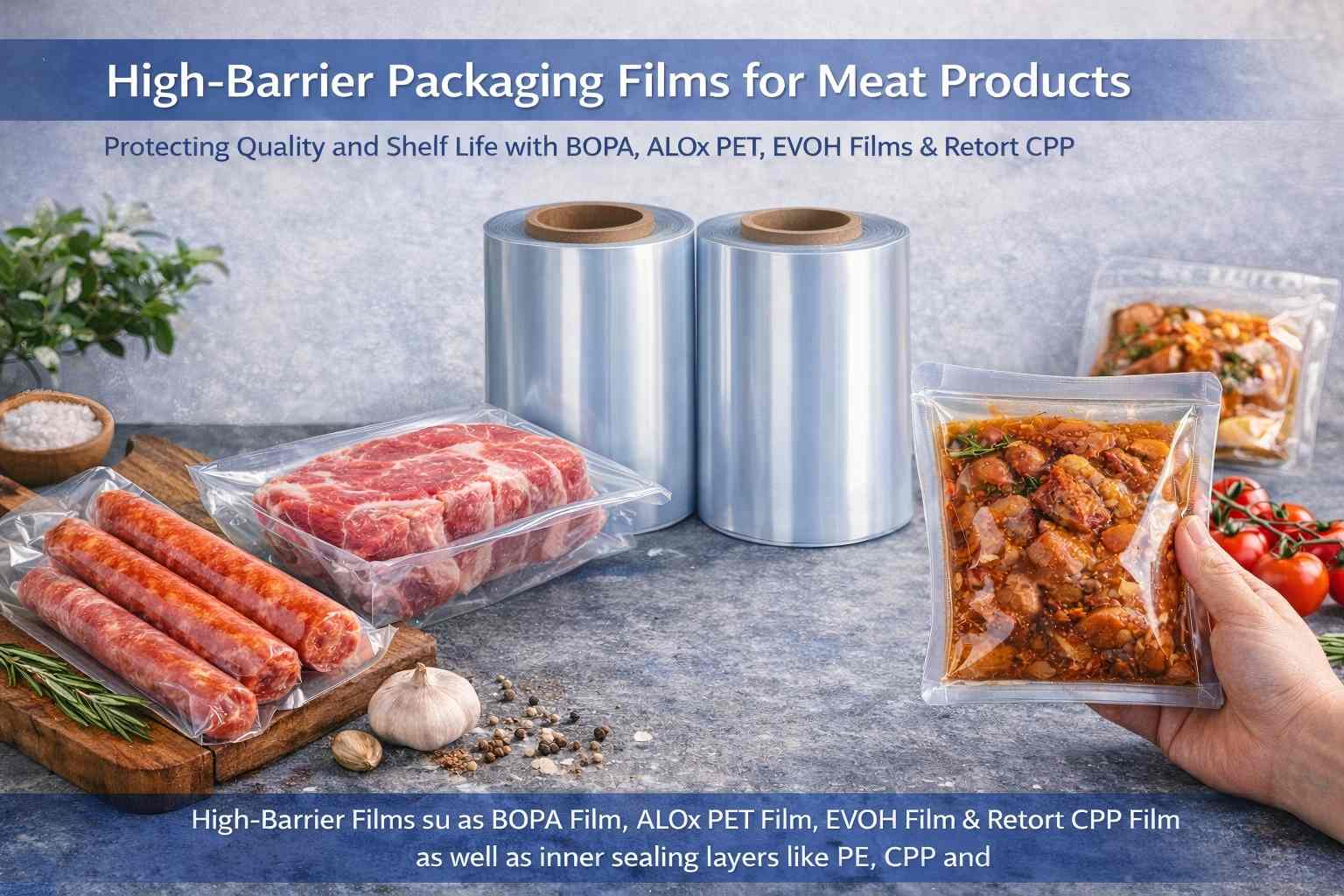 Buyer Tip: For long-shelf-life sausages, ham and retorted meat products, consider laminates such as BOPA/PE, BOPA/CPP or PET/AL/Retort CPP Film to achieve low oxygen transmission and strong seals.